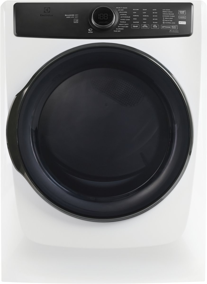 The Electrolux front load electric dryer with Balanced Dry technology prevents temperature spikes to keep fabrics cooler throughout the dry cycle. LuxCare Dry uses an advanced moisture sensor to prevent over or underdrying. The Electrolux Perfect Steam electric dryer with Predictive Dry has a more precise sensor to protect fabrics from overdrying.Read More